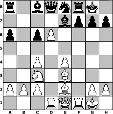 game notation in PGN-format [Event "Wrixum - Open die IX"] [Site "www.myChess.de"] [Date "2011.10.15"] [Round "1"] [White "bane"] [Black "Seneca"] [ECO "A34"] [WhitemyELO "1938"] [BlackmyELO "1476"] [Result "1-0"] [TimeControl "10/2592000"] [WhiteDays "59"] [BlackDays "36"] [MyChessNo "76896"] 1. c4 c5 2. Nc3 Nf6 3. e4 Nc6 4. Nf3 d6 5. d4 cxd4 6. Nxd4 e6 7. Be2 Be7 8. O-O Ne5 9. f4 Nc6 10. Be3 O-O 11. Qe1 a6 12. Rd1 e5 13. Nxc6 bxc6 14. fxe5 Ne8 15. exd6 1-0 position notation in FEN-format r1bqnrk1/4bppp/p1pP4/8/2P1P3/2N1B3/PPP1B1PP/3RQRK1 - - - 0 15 Captured white pieces: Captured black pieces: Click on a captured piece in order to display the desired move!