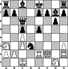 game notation in PGN-format [Event "Ja, is denn heut scho Weihnachten?"] [Site "www.myChess.de"] [Date "2014.12.06"] [Round "1"] [White "borsti"] [Black "haggard"] [ECO "B20"] [WhitemyELO "1235"] [BlackmyELO "1992"] [Result "0-1"] [TimeControl "10/2592000"] [WhiteDays "60"] [BlackDays "60"] [MyChessNo "97040"] 1. e4 c5 2. Bc4 Nc6 3. d3 g6 4. f4 Bg7 5. c3 Na5 6. Be3 Nxc4 7. dxc4 Qb6 8. Qc2 d6 9. Na3 Nf6 10. O-O-O Qc6 11. e5 Ng4 12. Re1 dxe5 13. h3 Nxe3 14. Qf2 Nxg2 15. Re2 Nxf4 16. Rh2 Nd3+ 0-1 position notation in FEN-format r1b1k2r/pp2ppbp/2q3p1/2p1p3/2P5/N1Pn3P/PP2RQ1R/2K3N1 - kq - 2 17 Captured white pieces: Captured black pieces: Click on a captured piece in order to display the desired move!