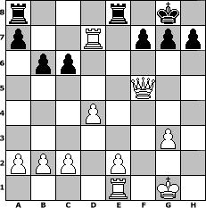game notation in PGN-format [Event "unter uns Nr. 10"] [Site "www.myChess.de"] [Date "2013.06.30"] [Round "1"] [White "borsti"] [Black "Master1"] [ECO "A00"] [WhitemyELO "1286"] [BlackmyELO "1290"] [Result "1-0"] [TimeControl "10/864000"] [WhiteDays "29"] [BlackDays "17"] [MyChessNo "89050"] 1. Nh3 d5 2. g3 e5 3. f4 Bxh3 4. Bxh3 exf4 5. O-O fxg3 6. hxg3 Bc5+ 7. d4 Bd6 8. Bf4 Bxf4 9. Rxf4 Nd7 10. Bxd7+ Qxd7 11. Nc3 Qh3 12. Rf3 Nf6 13. Qf1 Ng4 14. Qxh3 Nf6 15. Rf5 O-O 16. Nxd5 Nxd5 17. Rxd5 Rfe8 18. Re1 c6 19. Rd7 b6 20. Qf5 1-0 position notation in FEN-format r3r1k1/p2R1ppp/1pp5/5Q2/3P4/6P1/PPP1P3/4R1K1 - - - 1 20 Captured white pieces: Captured black pieces: Click on a captured piece in order to display the desired move!
