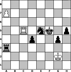 game notation in PGN-format [Event "6. Frankenwaldturnier"] [Site "www.myChess.de"] [Date "2008.03.19"] [Round "1"] [White "BobbyF4"] [Black "Naunhofer"] [ECO "B21"] [WhitemyELO "1623"] [BlackmyELO "1708"] [Result "0-1"] [TimeControl "10/864000"] [WhiteDays "10"] [BlackDays "59"] [MyChessNo "43596"] 1. e4 c5 2. f4 e6 3. Nf3 d5 4. Bb5+ Bd7 5. Bxd7+ Nxd7 6. d3 Bd6 7. O-O Ne7 8. c4 d4 9. Na3 a6 10. e5 Bc7 11. Ng5 Nf5 12. Qf3 Rb8 13. g4 Ne7 14. Qh3 h6 15. Ne4 Ng6 16. Nd6+ Bxd6 17. exd6 Nf6 18. f5 Nf8 19. g5 Ng8 20. fxe6 Nxe6 21. g6 Nf6 22. Bf4 Nxf4 23. Rxf4 O-O 24. Raf1 fxg6 25. Qe6+ Kh7 26. Nb1 Qe8 27. Re1 Qxe6 28. Rxe6 Rbe8 29. Rxe8 Rxe8 30. b4 b6 31. a4 Re6 32. a5 Rxd6 33. bxc5 bxc5 34. Rf2 Re6 35. Rb2 Nh5 36. Nd2 Nf4 37. Nf3 Re3 38. Nh4 Nxd3 39. Rb6 Nb4 40. Kf2 Rh3 41. Nf3 g5 42. Kg2 g4 43. Nd2 Re3 44. Kf2 Nd3+ 45. Kg1 Re1+ 46. Kg2 Re2+ 47. Kg3 Rxd2 48. Rxa6 h5 49. Rc6 g5 50. h4 gxh4+ 51. Kxh4 Rf2 52. a6 Ra2 53. Kg3 Ra3 54. Rc7+ Kg6 55. a7 Ne5+ 56. Kg2 Nxc4 57. Rc6+ Kf5 58. Rxc5+ Ne5 0-1 position notation in FEN-format 8/P7/8/2R1nk1p/3p2p1/r7/6K1/8 - - - 1 59 Captured white pieces: Captured black pieces: Click on a captured piece in order to display the desired move!