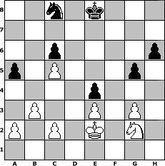 game notation in PGN-format [Event "^^Frohes neues Jahr^^"] [Site "www.myChess.de"] [Date "2007.12.29"] [Round "1"] [White "rux"] [Black "Helmut48"] [ECO "A21"] [WhitemyELO "1394"] [BlackmyELO "1395"] [Result "1/2-1/2"] [TimeControl "10/864000"] [WhiteDays "40"] [BlackDays "39"] [MyChessNo "41082"] 1. c4 e5 2. Nc3 c6 3. Nf3 f6 4. d4 Bb4 5. Bd2 Bxc3 6. Bxc3 e4 7. Nh4 g6 8. g3 Nh6 9. Qd2 g5 10. Ng2 Rg8 11. h4 Nf7 12. Qe3 d5 13. hxg5 Bf5 14. Qf4 Bg6 15. e3 fxg5 16. Qg4 Qd7 17. Qxd7+ Nxd7 18. cxd5 cxd5 19. Be2 h6 20. f3 exf3 21. Bxf3 Be4 22. Bxe4 dxe4 23. Rf1 Nd6 24. Bb4 Nc4 25. b3 Ncb6 26. Rc1 Rc8 27. Rxc8+ Nxc8 28. Ke2 Rg6 29. Rc1 Rc6 30. Rxc6 bxc6 31. Bc5 Nxc5 32. dxc5 a5 1/2-1/2 position notation in FEN-format 2n1k3/8/2p4p/p1P3p1/4p3/1P2P1P1/P1P1K1N1/8 - - - 0 33 Captured white pieces: Captured black pieces: Click on a captured piece in order to display the desired move!
