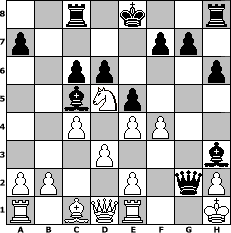 game notation in PGN-format [Event "^^Frohes neues Jahr^^"] [Site "www.myChess.de"] [Date "2007.12.29"] [Round "1"] [White "bluescreenlover"] [Black "Andylein1989"] [ECO "C23"] [WhitemyELO "1278"] [BlackmyELO "1412"] [Result "0-1"] [TimeControl "10/864000"] [WhiteDays "16"] [BlackDays "17"] [MyChessNo "41066"] 1. e4 e5 2. Bc4 Bc5 3. Nf3 Nc6 4. d3 h6 5. Bd5 Nge7 6. c4 d6 7. Nc3 Nd4 8. O-O Bg4 9. Bxb7 Rb8 10. Bd5 Nxd5 11. Nxd5 Nxf3+ 12. gxf3 Bh3 13. Re1 c6 14. Qa4 Rc8 15. f4 Qh4 16. Qd1 Qxf2+ 17. Kh1 Qg2# 0-1 position notation in FEN-format 2r1k2r/p4pp1/2pp3p/2bNp3/2P1PP2/3P3b/PP2P1qP/R1BQR2K - k - 2 18 Captured white pieces: Captured black pieces: Click on a captured piece in order to display the desired move!