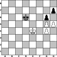 game notation in PGN-format [Event "Schach zur Fussball WM"] [Site "www.myChess.de"] [Date "2014.06.12"] [Round "2"] [White "hape50"] [Black "Schefsche"] [ECO "D00"] [WhitemyELO "1293"] [BlackmyELO "1430"] [Result "1/2-1/2"] [TimeControl "10/1728000"] [WhiteDays "19"] [BlackDays "13"] [MyChessNo "94748"] 1. d4 d5 2. e3 Bf5 3. Nf3 e6 4. h3 Nc6 5. Bd3 Bxd3 6. Qxd3 Nb4 7. Qb5+ c6 8. Qe2 Nf6 9. a3 Na6 10. O-O Bd6 11. Nbd2 O-O 12. Nh2 Bxh2+ 13. Kxh2 Re8 14. Nf3 Ne4 15. Kg1 Nc7 16. Ne5 f6 17. Nf3 b5 18. Nd2 e5 19. dxe5 Rxe5 20. Nf3 Re6 21. Nd4 Rd6 22. Qg4 a5 23. Nf5 Rd7 24. Ng3 Nxg3 25. fxg3 a4 26. Bd2 d4 27. e4 c5 28. Rf2 Rf7 29. b4 axb3 30. cxb3 Qe7 31. Raf1 Rxa3 32. b4 c4 33. Bh6 Ne8 34. Rf5 Re3 35. Bxe3 dxe3 36. Rxb5 Nd6 37. Rb8+ Rf8 38. Rxf8+ Kxf8 39. Qe2 Qxe4 40. Kh2 Nb5 41. Rd1 Ke7 42. Rc1 Na3 43. Qa2 e2 44. Qxa3 e1=Q 45. b5+ Kd8 46. Qd6+ Kc8 47. Rxe1 Qxe1 48. Qc6+ Kd8 49. Qxc4 Qa5 50. Qd3+ Ke7 51. Qd5 Qb6 52. h4 g6 53. Qe4+ Kd7 54. Qc4 Qb7 55. Kh3 Qc8 56. Qf7+ Kd6+ 57. Kh2 Qd7 58. Qxf6+ Kc7 59. b6+ Kb7 60. Qf4 Kxb6 61. g4 Qe7 62. g5 Qc7 63. Qxc7+ Kxc7 64. Kg3 Kd6 65. Kf4 Ke6 66. g4 Kd6 67. h5 Ke6 68. Ke4 Kd6 1/2-1/2 position notation in FEN-format 8/7p/3k2p1/6PP/4K1P1/8/8/8 - - - 3 69 Captured white pieces: Captured black pieces: Click on a captured piece in order to display the desired move!