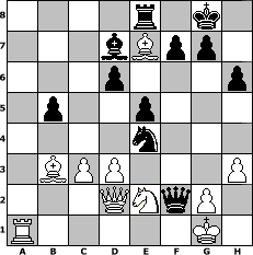 game notation in PGN-format [Event "3. Norderstedter DENK MAL Open 2012"] [Site "www.myChess.de"] [Date "2012.02.08"] [Round "1"] [White "faustballer"] [Black "UPS"] [ECO "C41"] [WhitemyELO "1542"] [BlackmyELO "1625"] [Result "0-1"] [TimeControl "10/2592000"] [WhiteDays "18"] [BlackDays "27"] [MyChessNo "79822"] 1. e4 e5 2. Nf3 d6 3. h3 Nc6 4. Bb5 Bd7 5. Nc3 Nf6 6. a4 Be7 7. d3 O-O 8. Bg5 a6 9. Bc4 Na5 10. Nd2 c6 11. Ba2 b5 12. axb5 axb5 13. Nf3 Qc7 14. O-O h6 15. Bh4 Rfe8 16. Ne2 Nb7 17. b4 Nd8 18. Qd2 Ne6 19. Bb3 Nf8 20. Bg3 Ng6 21. Nh4 Nxh4 22. Bxh4 c5 23. bxc5 Qxc5 24. c3 Rxa1 25. Rxa1 Nxe4 26. Bxe7 Qxf2+ 0-1 position notation in FEN-format 4r1k1/3bBpp1/3p3p/1p2p3/4n3/1BPP3P/3QNqP1/R5K1 - - - 0 27 Captured white pieces: Captured black pieces: Click on a captured piece in order to display the desired move!