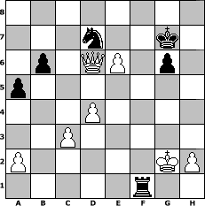 game notation in PGN-format [Event "Fr"] [Site "www.myChess.de"] [Date "2008.01.28"] [Round "1"] [White "Leeloo"] [Black "jlarue700"] [ECO "D15"] [WhitemyELO "1514"] [BlackmyELO "1472"] [Result "1-0"] [TimeControl "10/1728000"] [WhiteDays "10"] [BlackDays "19"] [MyChessNo "42064"] 1. d4 d5 2. c4 c6 3. Nf3 Nf6 4. Nc3 e6 5. Bg5 h6 6. Bxf6 Qxf6 7. e3 Bb4 8. Be2 Nd7 9. O-O O-O 10. Qc2 Bxc3 11. bxc3 b6 12. Nd2 e5 13. Rab1 e4 14. cxd5 cxd5 15. f3 Qg5 16. fxe4 Qxe3+ 17. Rf2 Bb7 18. e5 f5 19. Rbf1 a5 20. Kh1 g6 21. Bb5 Nb8 22. Rf3 Qg5 23. Rg3 Qh5 24. Nf3 Bc6 25. Be2 Kg7 26. Ng5 Qxg5 27. Rxg5 hxg5 28. Qd2 f4 29. Bg4 Re8 30. g3 Bd7 31. Bxd7 Nxd7 32. gxf4 gxf4 33. Rxf4 Re6 34. Qg2 Rf8 35. Qxd5 Re7 36. Qd6 Ref7 37. Rxf7+ Rxf7 38. e6 Rf1+ 39. Kg2 1-0 position notation in FEN-format 8/3n2k1/1p1QP1p1/p7/3P4/2P5/P5KP/5r2 - - - 2 39 Captured white pieces: ![]() ![]() ![]() ![]() ![]() ![]() ![]() ![]() ![]() ![]() ![]() ![]() ![]() ![]() ![]() Captured black pieces: ![]() ![]() ![]() ![]() ![]() ![]() ![]() ![]() ![]() ![]() ![]() ![]() ![]() ![]() ![]() Click on a captured piece in order to display the desired move!