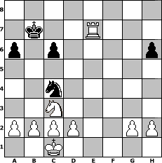 game notation in PGN-format [Event "Blackmar-Diemer"] [Site "www.myChess.de"] [Date "2009.08.30"] [Round "1"] [White "rakl"] [Black "Caligula"] [ECO "D00"] [WhitemyELO "1883"] [BlackmyELO "1416"] [Result "1-0"] [TimeControl "10/2592000"] [WhiteDays "119"] [BlackDays "120"] [MyChessNo "58649"] 1. d4 d5 2. e4 dxe4 3. Nc3 Nf6 4. f3 exf3 5. Qxf3 e6 6. Be3 Nc6 7. O-O-O Qd7 8. Bc4 a6 9. d5 Ne5 10. dxe6 Qc6 11. exf7+ Nxf7 12. Qxc6+ bxc6 13. Nf3 h6 14. Rhe1 Nd6 15. Bxh6+ Kd7 16. Ne5+ Ke8 17. Nxc6+ Kd7 18. Ne5+ Ke7 19. Ng6+ Kd7 20. Nxh8 gxh6 21. Ng6 Bg7 22. Re7+ Kc6 23. Rxg7 Nxc4 24. Ne7+ Kb7 25. Rd4 Be6 26. Rg6 Re8 27. Rxf6 Rxe7 28. Re4 c6 29. Rfxe6 Rf7 30. Re7+ Rxe7 31. Rxe7+ 1-0 position notation in FEN-format 8/1k2R3/p1p4p/8/2n5/2N5/PPPP2PP/2K5 - - - 0 31 Captured white pieces: Captured black pieces: Click on a captured piece in order to display the desired move!