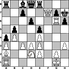 game notation in PGN-format [Event "Turnier in den M"] [Site "www.myChess.de"] [Date "2014.02.19"] [Round "1"] [White "Andylein1989"] [Black "Mattheus"] [ECO "C50"] [WhitemyELO "1339"] [BlackmyELO "1218"] [Result "1-0"] [TimeControl "10/2592000"] [WhiteDays "30"] [BlackDays "27"] [MyChessNo "93082"] 1. e4 e5 2. Nf3 Nc6 3. Bc4 h6 4. O-O Nf6 5. d3 Bc5 6. c3 d6 7. h3 O-O 8. b4 Bb6 9. a3 Re8 10. Be3 Bxe3 11. fxe3 a6 12. Nbd2 b5 13. Ba2 a5 14. Qb3 a4 15. Qxf7+ Kh8 16. Nh4 Ne7 17. Ng6+ Kh7 18. Rxf6 Nxg6 19. Rxg6 1-0 position notation in FEN-format r1bqr3/2p2Qpk/3p2Rp/1p2p3/pP2P3/P1PPP2P/B2NP1P1/R5K1 - - - 0 19 Captured white pieces: Captured black pieces: Click on a captured piece in order to display the desired move!