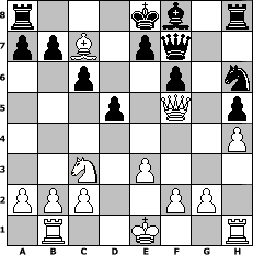 game notation in PGN-format [Event "^^Frohes neues Jahr^^"] [Site "www.myChess.de"] [Date "2007.12.29"] [Round "1"] [White "Master1"] [Black "crca108"] [ECO "A40"] [WhitemyELO "1242"] [BlackmyELO "1377"] [Result "1/2-1/2"] [TimeControl "10/864000"] [WhiteDays "25"] [BlackDays "28"] [MyChessNo "41102"] 1. d4 c6 2. Nf3 d5 3. Nc3 h6 4. Bf4 g5 5. Be5 f6 6. Bg3 Bf5 7. h4 g4 8. Nd2 Qb6 9. Rb1 Qxd4 10. e3 Qb6 11. Na4 Qa5 12. Nc3 Na6 13. Nb3 Qd8 14. Bd3 Qd7 15. Bxf5 Qxf5 16. Nd4 Qh7 17. Qxg4 h5 18. Qf5 Qg7 19. Ne6 Qf7 20. Nc7+ Nxc7 21. Bxc7 Nh6 1/2-1/2 position notation in FEN-format r3kb1r/ppB1pq2/2p2p1n/3p1Q1p/7P/2N1P3/PPP2PP1/1R2K2R - Kkq - 1 22 Captured white pieces: Captured black pieces: Click on a captured piece in order to display the desired move!