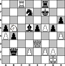 game notation in PGN-format [Event "Westerw"] [Site "www.myChess.de"] [Date "2010.12.02"] [Round "1"] [White "deepsabel"] [Black "Chaos"] [ECO "D02"] [WhitemyELO "2007"] [BlackmyELO "1734"] [Result "1/2-1/2"] [TimeControl "10/2592000"] [WhiteDays "30"] [BlackDays "30"] [MyChessNo "70271"] 1. d4 d5 2. Nf3 Nf6 3. c4 c6 4. Nc3 e6 5. Bg5 h6 6. Bh4 dxc4 7. e4 g5 8. Bg3 b5 9. Be2 Bb7 10. O-O Nbd7 11. Ne5 Bg7 12. Nxd7 Nxd7 13. Bd6 a6 14. a4 e5 15. d5 c5 16. b4 cxb4 17. Bxb4 a5 18. Bd6 b4 19. Nb5 Rc8 20. Bxc4 Rxc4 21. Qb3 Rc8 22. Rac1 Bf8 23. Rxc8 Qxc8 24. Qe3 Qc2 25. Rc1 Qb2 26. h4 f5 27. exf5 Bxd5 28. Rc8+ Kf7 29. Bxf8 Rxf8 1/2-1/2 position notation in FEN-format 2R2r2/3n1k2/7p/pN1bpPp1/Pp5P/4Q3/1q1P1PP1/6K1 - - - 0 30 Captured white pieces: ![]() ![]() ![]() ![]() ![]() ![]() ![]() ![]() ![]() ![]() ![]() ![]() ![]() ![]() ![]() Captured black pieces: ![]() ![]() ![]() ![]() ![]() ![]() ![]() ![]() ![]() ![]() ![]() ![]() ![]() ![]() ![]() Click on a captured piece in order to display the desired move!