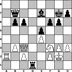 game notation in PGN-format [Event "Bremer Schl"] [Site "www.myChess.de"] [Date "2008.11.01"] [Round "1"] [White "Fighter"] [Black "larlinde"] [ECO "C68"] [WhitemyELO "2087"] [BlackmyELO "2207"] [Result "1/2-1/2"] [TimeControl "10/2592000"] [WhiteDays "58"] [BlackDays "83"] [MyChessNo "49415"] 1. e4 e5 2. Nf3 Nc6 3. Bb5 a6 4. Bxc6 dxc6 5. O-O Qd6 6. d3 Be6 7. Be3 Nf6 8. Qe2 Be7 9. Nbd2 Ng4 10. Nc4 Bxc4 11. dxc4 Nxe3 12. Qxe3 Qe6 13. b3 O-O 14. Rad1 Rfd8 15. c5 f6 16. Rfe1 a5 17. h3 g6 18. Rd3 a4 19. Rxd8+ Rxd8 20. Rb1 Kg7 21. Qc3 axb3 22. axb3 b6 23. cxb6 cxb6 24. Ra1 Qd7 25. Qe3 Bc5 26. Qc3 Qe7 27. g3 Rd4 28. Ra8 Rd1+ 29. Kg2 Qb7 30. Ra2 Be7 1/2-1/2 position notation in FEN-format 8/1q2b1kp/1pp2pp1/4p3/4P3/1PQ2NPP/R1P2PK1/3r4 - - - 7 31 Captured white pieces: Captured black pieces: Click on a captured piece in order to display the desired move!