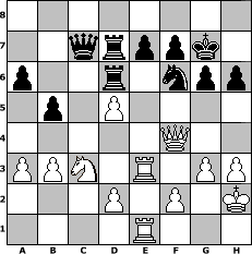 game notation in PGN-format [Event "Jahreswechsel"] [Site "www.myChess.de"] [Date "2009.12.30"] [Round "2"] [White "sprinterde"] [Black "espero"] [ECO "A56"] [WhitemyELO "1565"] [BlackmyELO "1692"] [Result "1/2-1/2"] [TimeControl "10/1728000"] [WhiteDays "80"] [BlackDays "71"] [MyChessNo "61951"] 1. d4 Nf6 2. c4 c5 3. e3 g6 4. Nc3 Bg7 5. Nf3 O-O 6. Be2 cxd4 7. exd4 d5 8. Bg5 dxc4 9. Bxc4 Bg4 10. O-O Nc6 11. d5 Bxf3 12. Qxf3 Ne5 13. Qe2 Nxc4 14. Qxc4 Rc8 15. Qb5 b6 16. h3 Rc5 17. Qb3 h6 18. Be3 Rc7 19. Rfe1 Rd7 20. Rad1 Qa8 21. Bd4 Rfd8 22. g3 Nh7 23. Bxg7 Kxg7 24. Qb4 Qb7 25. Qd4+ Nf6 26. Qe5 Qc7 27. Qd4 a6 28. a3 b5 29. Re3 Kh7 30. Kh2 Rd6 31. Qf4 Kg7 32. Rde1 R8d7 33. b3 1/2-1/2 position notation in FEN-format 8/2qrppk1/p2r1npp/1p1P4/5Q2/PPN1R1PP/3P1P1K/4R3 - - - 0 33 Captured white pieces: Captured black pieces: Click on a captured piece in order to display the desired move!
