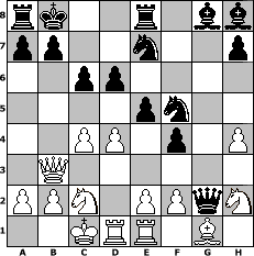 game notation in PGN-format [Event "Albspiele-Chess960"] [Site "www.myChess.de"] [Date "2009.11.08"] [Round "1"] [White "Haki"] [Black "Joschi"] [Variant "Fischerrandom"] [SetUp "1"] [FEN "rkqnrnbb/pppppppp/8/8/8/8/PPPPPPPP/RKQNRNBB w KQkq - 0 1"] [WhitemyELO "1458"] [BlackmyELO "1576"] [Result "0-1"] [TimeControl "10/2592000"] [WhiteDays "29"] [BlackDays "30"] [MyChessNo "60469"] 1. e4 e5 2. g4 g6 3. Nde3 Nc6 4. c3 Ne6 5. h4 Ne7 6. Qc2 d6 7. O-O-O Qd7 8. d3 Ng7 9. Bg2 f5 10. exf5 gxf5 11. c4 f4 12. Qb3 c6 13. Nc2 Qxg4 14. d4 Qxg2 15. Nh2 Ngf5 0-1 position notation in FEN-format rk2r1bb/pp2n2p/2pp4/4pn2/2PP1p1P/1Q6/PPN1PPqN/2KRR1B1 - kq - 2 16 Captured white pieces: ![]() ![]() ![]() ![]() ![]() ![]() ![]() ![]() ![]() ![]() ![]() ![]() ![]() ![]() ![]() Captured black pieces: ![]() ![]() ![]() ![]() ![]() ![]() ![]() ![]() ![]() ![]() ![]() ![]() ![]() ![]() ![]() Click on a captured piece in order to display the desired move!