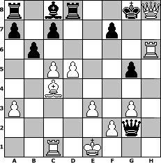 game notation in PGN-format [Event "d4 f"] [Site "www.myChess.de"] [Date "2005.05.31"] [Round "1"] [White "bane"] [Black "Knight"] [ECO "E00"] [WhitemyELO "1762"] [BlackmyELO "1230"] [Result "1-0"] [TimeControl "10/1728000"] [WhiteDays "60"] [BlackDays "60"] [MyChessNo "13736"] 1. d4 Nf6 2. c4 e6 3. Bg5 Bb4+ 4. Nc3 O-O 5. a3 Bxc3+ 6. bxc3 Nc6 7. c5 d5 8. Nf3 Re8 9. e3 h6 10. Bh4 g5 11. Bg3 Ne4 12. Nd2 Nxg3 13. hxg3 Qf6 14. c4 dxc4 15. Bxc4 e5 16. d5 Na5 17. Qa4 Rd8 18. Qxa5 e4 19. Rc1 b6 20. Nxe4 Qe7 21. Qc3 Qxe4 22. Rxh6 Qxg2 23. Qh8# 1-0 position notation in FEN-format r1br2kQ/p1p2p2/1p5R/2PP2p1/2B5/P3P1P1/5Pq1/2R1K3 - - - 1 23 Captured white pieces: Captured black pieces: Click on a captured piece in order to display the desired move!