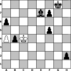 game notation in PGN-format [Event "Turnier in den M"] [Site "www.myChess.de"] [Date "2014.02.19"] [Round "1"] [White "Achimkogge"] [Black "Winston"] [ECO "D00"] [WhitemyELO "1436"] [BlackmyELO "1450"] [Result "0-1"] [TimeControl "10/2592000"] [WhiteDays "30"] [BlackDays "30"] [MyChessNo "93051"] 1. d4 d5 2. f3 h6 3. c3 a6 4. Bf4 Nc6 5. e4 dxe4 6. fxe4 Nf6 7. Bd3 Bg4 8. Qb3 b5 9. Nf3 Bxf3 10. gxf3 e5 11. Be3 exd4 12. cxd4 Nxd4 13. Bxd4 Qxd4 14. Qc2 c5 15. Be2 c4 16. Qd2 Qb6 17. a3 Bc5 18. Kf1 O-O 19. Nc3 Rad8 20. Qc2 Qe6 21. Kg2 Nh5 22. Qc1 Qg6+ 23. Kf1 Rfe8 24. Nd5 Qc6 25. Qc2 Re5 26. Rd1 Rde8 27. Rd2 R5e6 28. Ke1 Ba7 29. Kd1 Rg6 30. f4 Nf6 31. Nxf6+ Rxf6 32. Rf1 Be3 33. Rd5 Bxf4 34. h4 Qb6 35. Bg4 Rd8 36. Bf5 Rxf5 37. Rxd8+ Qxd8+ 38. Ke2 Qe8 39. Kd1 Rf6 40. Qe2 Qd7+ 41. Kc2 Qh3 42. e5 Qb3+ 43. Kb1 Rf5 44. Qc2 Qxc2+ 45. Kxc2 h5 46. Kd1 g6 47. Kc2 Bxe5 48. Rxf5 gxf5 49. Kc1 Bf6 50. Kc2 Bxh4 51. b3 cxb3+ 52. Kxb3 Be7 53. Kb2 h4 54. Kb3 h3 55. a4 b4 56. Kc4 h2 0-1 position notation in FEN-format 6k1/4bp2/p7/5p2/PpK5/8/7p/8 - - - 0 57 Captured white pieces: Captured black pieces: Click on a captured piece in order to display the desired move!