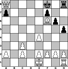 game notation in PGN-format [Event "Fr"] [Site "www.myChess.de"] [Date "2004.04.24"] [Round "1"] [White "Nightflight"] [Black "EduardM"] [ECO "C46"] [WhitemyELO "1581"] [BlackmyELO "1161"] [Result "1-0"] [TimeControl "10/2592000"] [WhiteDays "46"] [BlackDays "50"] [MyChessNo "4126"] 1. e4 e5 2. Nf3 Nc6 3. Nc3 Bc5 4. Nxe5 Nxe5 5. d4 Bb4 6. dxe5 Bxc3+ 7. bxc3 d6 8. exd6 cxd6 9. Bb5+ Bd7 10. Qxd6 Bxb5 11. Qe5+ Ne7 12. Qxb5+ Nc6 13. Qxb7 Ne7 14. Ba3 g6 15. Rd1 h5 16. Rxd8+ Kxd8 17. Bxe7+ Ke8 18. Bf6 Kf8 19. Qxa8# 1-0 position notation in FEN-format Q4k1r/p4p2/5Bp1/7p/4P3/2P5/P1P1PPPP/4K2R - K - 0 19 Captured white pieces: ![]() ![]() ![]() ![]() ![]() ![]() ![]() ![]() ![]() ![]() ![]() ![]() ![]() ![]() ![]() Captured black pieces: ![]() ![]() ![]() ![]() ![]() ![]() ![]() ![]() ![]() ![]() ![]() ![]() ![]() ![]() ![]() Click on a captured piece in order to display the desired move!
