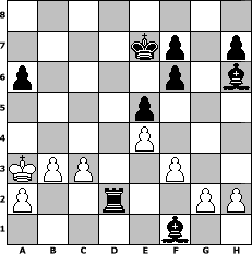 game notation in PGN-format [Event "Trainingslager II"] [Site "www.myChess.de"] [Date "2011.05.24"] [Round "2"] [White "reisender"] [Black "Lemmi11"] [ECO "D01"] [WhitemyELO "1322"] [BlackmyELO "1706"] [Result "0-1"] [TimeControl "10/1728000"] [WhiteDays "20"] [BlackDays "20"] [MyChessNo "74146"] 1. d4 d5 2. Nc3 Nf6 3. Bg5 c5 4. Bxf6 gxf6 5. e3 cxd4 6. Qxd4 e6 7. O-O-O a6 8. e4 Nc6 9. Qd2 d4 10. Nce2 e5 11. Kb1 Be6 12. Nc1 Qa5 13. Qxa5 Nxa5 14. f3 Bh6 15. Bd3 b5 16. Nge2 Nc4 17. Bxc4 bxc4 18. c3 d3 19. Nxd3 cxd3 20. Rxd3 Bc4 21. Rd6 Bxe2 22. Re1 Ke7 23. Rb6 Bd3+ 24. Ka1 Rhb8 25. Rxb8 Rxb8 26. Rd1 Bc2 27. Rf1 Rd8 28. b3 Rd2 29. Kb2 Bd3+ 30. Ka3 Bxf1 0-1 position notation in FEN-format 8/4kp1p/p4p1b/4p3/4P3/KPP2P2/P2r2PP/5b2 - - - 0 31 Captured white pieces: Captured black pieces: Click on a captured piece in order to display the desired move!