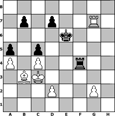 game notation in PGN-format [Event "Wanderpokal April - Chess960"] [Site "www.myChess.de"] [Date "2006.04.01"] [Round "1"] [White "schlachtross"] [Black "bane"] [Variant "Fischerrandom"] [SetUp "1"] [FEN "rbnkqnbr/pppppppp/8/8/8/8/PPPPPPPP/RBNKQNBR w KQkq - 0 1"] [WhitemyELO "1949"] [BlackmyELO "1929"] [Result "0-1"] [TimeControl "10/86400"] [WhiteDays "00"] [BlackDays "02"] [MyChessNo "24164"] 1. f4 e5 2. fxe5 Qxe5 3. Nd3 Qd5 4. e4 Qg5 5. Qe2 Ne6 6. Be3 Qa5 7. Ng3 Nd6 8. b3 f6 9. Rf1 c6 10. c4 Bc7 11. Nf5 Nxf5 12. exf5 Ng5 13. Bxg5 fxg5 14. Re1 O-O-O 15. Qg4 Bxc4 16. bxc4 Qa4+ 17. Bc2 h5 18. Bxa4 hxg4 19. Re2 Rxh2 20. Kc2 Rh6 21. Rae1 Rf6 22. Re7 Rxf5 23. Rxg7 Bb6 24. Re5 Rxe5 25. Nxe5 g3 26. Rxg5 Bf2 27. Nf7 Rf8 28. Nd6+ Kc7 29. Nf5 a6 30. Nxg3 Bxg3 31. Rxg3 Rf4 32. Bb3 c5 33. Rg7 Kd6 34. a4 a5 35. Kc3 Ke6 0-1 position notation in FEN-format 8/1p1p2R1/4k3/p1p5/P1P2r2/1BK5/3P2P1/8 - - - 2 36 Captured white pieces: Captured black pieces: Click on a captured piece in order to display the desired move!