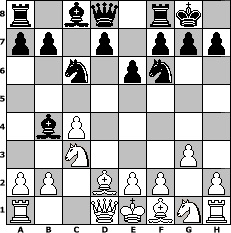 game notation in PGN-format [Event "Katalanisch"] [Site "www.myChess.de"] [Date "2012.06.11"] [Round "2"] [White "lasker"] [Black "Joschi"] [ECO "E00"] [WhitemyELO "1417"] [BlackmyELO "1594"] [Result "0-1"] [TimeControl "10/1728000"] [WhiteDays "00"] [BlackDays "19"] [MyChessNo "82184"] 1. d4 Nf6 2. c4 e6 3. g3 c5 4. Nc3 cxd4 5. Qxd4 Nc6 6. Qd1 Bb4 7. Bd2 O-O 0-1 position notation in FEN-format r1bq1rk1/pp1p1ppp/2n1pn2/8/1bP5/2N3P1/PP1BPP1P/R2QKBNR - KQ - 5 8 Captured white pieces: Captured black pieces: Click on a captured piece in order to display the desired move!