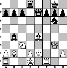 game notation in PGN-format [Event "Orang - Utan"] [Site "www.myChess.de"] [Date "2012.03.06"] [Round "1"] [White "pepo47"] [Black "espero"] [ECO "A00"] [WhitemyELO "1983"] [BlackmyELO "1620"] [Result "1-0"] [TimeControl "10/2592000"] [WhiteDays "57"] [BlackDays "55"] [MyChessNo "80361"] 1. b4 e5 2. Bb2 Bxb4 3. Bxe5 Nf6 4. c4 Nc6 5. Bb2 O-O 6. Nf3 d5 7. cxd5 Nxd5 8. e3 Re8 9. Be2 Rxe3 10. fxe3 Nxe3 11. Qb3 Qe7 12. Ne5 Nxg2+ 13. Kd1 Nxe5 14. Qg3 Ng6 15. Qxg2 Bf5 16. Rf1 Be4 17. Qg3 Rd8 18. Nc3 1-0 position notation in FEN-format 3r2k1/ppp1qppp/6n1/8/1b2b3/2N3Q1/PB1PB2P/R2K1R2 - - - 6 18 Captured white pieces: Captured black pieces: Click on a captured piece in order to display the desired move!
