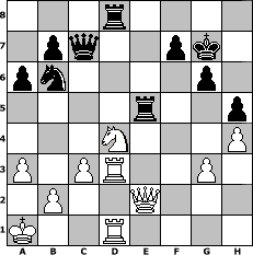 game notation in PGN-format [Event "Turnier zum 80.Geburtstag von Viktor Kortschnoi"] [Site "www.myChess.de"] [Date "2011.03.22"] [Round "1"] [White "Lohl"] [Black "HenrySchinasky"] [ECO "B76"] [WhitemyELO "1868"] [BlackmyELO "2104"] [Result "1/2-1/2"] [TimeControl "10/2592000"] [WhiteDays "074"] [BlackDays "120"] [MyChessNo "72972"] 1. e4 c5 2. Nf3 d6 3. d4 cxd4 4. Nxd4 Nf6 5. Nc3 g6 6. Be3 Bg7 7. f3 O-O 8. Bc4 Nc6 9. Qd2 Bd7 10. O-O-O Rc8 11. Bb3 Ne5 12. h4 h5 13. Bh6 Nc4 14. Bxc4 Rxc4 15. Bxg7 Kxg7 16. Kb1 Qa5 17. a3 Rfc8 18. Nb3 Qa6 19. Qe2 Ba4 20. Rhe1 Qb6 21. Nxa4 Rxa4 22. e5 dxe5 23. Qxe5 Rac4 24. Rd2 a6 25. Nd4 e6 26. Red1 R4c5 27. Qe2 Nd5 28. Ka1 Qc7 29. c3 Nb6 30. Rd3 Rd5 31. g3 Rcd8 32. f4 e5 33. fxe5 Rxe5 1/2-1/2 position notation in FEN-format 3r4/1pq2pk1/pn4p1/4r2p/3N3P/P1PR2P1/1P2Q3/K2R4 - - - 0 34 Captured white pieces: Captured black pieces: Click on a captured piece in order to display the desired move!