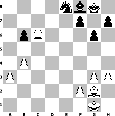 game notation in PGN-format [Event "Der HSF feiert Geburtstag-feiert gerne dabei mit!"] [Site "www.myChess.de"] [Date "2012.05.01"] [Round "1"] [White "neoprogtroll"] [Black "Duschgel"] [ECO "B18"] [WhitemyELO "1773"] [BlackmyELO "1585"] [Result "1-0"] [TimeControl "10/2592000"] [WhiteDays "29"] [BlackDays "30"] [MyChessNo "81509"] 1. e4 c6 2. d4 d5 3. Nc3 dxe4 4. Nxe4 Bf5 5. Nc5 b6 6. Nb3 e6 7. Nf3 Nf6 8. g3 Be7 9. Bg2 O-O 10. O-O Nbd7 11. Qe2 c5 12. Ne5 Rc8 13. Nc6 Rxc6 14. Bxc6 Qc7 15. Bg2 cxd4 16. Nxd4 Bg6 17. Be3 e5 18. Nb5 Qxc2 19. Qxc2 Bxc2 20. Nxa7 Nc5 21. Nc6 Bd6 22. Bxc5 Bxc5 23. Rac1 Ba4 24. Nxe5 Re8 25. Nd3 Bb5 26. Rfd1 Bxd3 27. Rxd3 Ng4 28. Rd2 g6 29. h3 Nf6 30. a3 Ne4 31. Re2 Nd6 32. Rxe8+ Nxe8 33. b4 Bf8 34. Rc6 1-0 position notation in FEN-format 4nbk1/5p1p/1pR3p1/8/1P6/P5PP/5PB1/6K1 - - - 2 34 Captured white pieces: Captured black pieces: Click on a captured piece in order to display the desired move!