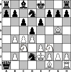 game notation in PGN-format [Event "Winterturnier"] [Site "www.myChess.de"] [Date "2009.11.12"] [Round "1"] [White "werderfan"] [Black "gambito"] [ECO "D10"] [WhitemyELO "1509"] [BlackmyELO "1530"] [Result "0-1"] [TimeControl "10/3456000"] [WhiteDays "78"] [BlackDays "45"] [MyChessNo "60568"] 1. d4 d5 2. c4 c6 3. Nc3 Nf6 4. Bg5 Nbd7 5. e3 Qa5 6. Qd2 e6 7. Nf3 Bb4 8. a3 Ne4 9. axb4 Qxa1+ 10. Ke2 Nxd2 0-1 position notation in FEN-format r1b1k2r/pp1n1ppp/2p1p3/3p2B1/1PPP4/2N1PN2/1P1nKPPP/q4B1R - kq - 0 11 Captured white pieces: Captured black pieces: Click on a captured piece in order to display the desired move!