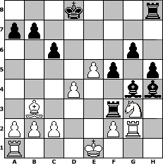 game notation in PGN-format [Event "Schach und Schnee schippen"] [Site "www.myChess.de"] [Date "2021.02.12"] [Round "2"] [White "Lohl"] [Black "Ziegert"] [ECO "B02"] [WhitemyELO "1818"] [BlackmyELO "2109"] [Result "0-1"] [TimeControl "10/2592000"] [WhiteDays "00"] [BlackDays "09"] [MyChessNo "121161"] 1. e4 Nf6 2. Nc3 e5 3. Nf3 Nc6 4. Bb5 Nd4 5. Ba4 c6 6. Nxe5 d6 7. Nf3 Bg4 8. d3 d5 9. Be3 Nxf3+ 10. gxf3 Bh5 11. Bd4 Qd6 12. Bxf6 Qxf6 13. Nxd5 Qd6 14. Nc3 Qf4 15. Nd5 Qd6 16. Nc3 O-O-O 17. Qe2 g6 18. e5 Qd4 19. Qe4 f5 20. Qxd4 Rxd4 21. Bb3 Bxf3 22. Rg1 Rh4 23. h3 Rxh3 24. Ne4 Be7 25. Nd2 Bg4 26. d4 Bh4 27. Nf1 Rf3 28. Ng3 h5 29. Rg2 Kd8 0-1 position notation in FEN-format 3k3r/pp6/2p3p1/4Pp1p/3P2bb/1B3rN1/PPP2PR1/R3K3 - Q - 2 30 Captured white pieces: Captured black pieces: Click on a captured piece in order to display the desired move!