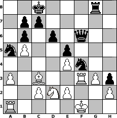 game notation in PGN-format [Event "Pedro Damiano"] [Site "www.myChess.de"] [Date "2016.09.18"] [Round "2"] [White "sprinterde"] [Black "Helmut48"] [ECO "C40"] [WhitemyELO "1652"] [BlackmyELO "2010"] [Result "0-1"] [TimeControl "10/2592000"] [WhiteDays "82"] [BlackDays "90"] [MyChessNo "105008"] 1. e4 e5 2. Nf3 f6 3. Nc3 Nc6 4. Bc4 Bc5 5. Nh4 g6 6. O-O d6 7. Nf3 Nge7 8. a3 g5 9. b4 Bb6 10. Na4 h5 11. Nxb6 axb6 12. Bb2 h4 13. d4 Ng6 14. dxe5 fxe5 15. b5 Na5 16. Ba2 h3 17. g3 Qf6 18. Qd3 Rf8 19. Nd2 Be6 20. Bxe6 Qxe6 21. Qe3 g4 22. Qg5 Rf6 23. Bc3 O-O-O 24. f4 gxf3 25. Rxf3 Nf4 26. Kf1 Rg8 27. Qxf6 Qxf6 0-1 position notation in FEN-format 2k3r1/1pp5/1p1p1q2/nP2p3/4Pn2/P1B2RPp/2PNP2P/R4K2 - - - 0 28 Captured white pieces: Captured black pieces: Click on a captured piece in order to display the desired move!
