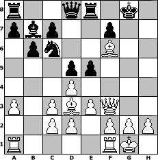 game notation in PGN-format [Event "Auf`s Neue Jahr 2018"] [Site "www.myChess.de"] [Date "2018.01.06"] [Round "1"] [White "alibengali"] [Black "Knight"] [ECO "D00"] [WhitemyELO "1638"] [BlackmyELO "1116"] [Result "1-0"] [TimeControl "10/2592000"] [WhiteDays "49"] [BlackDays "60"] [MyChessNo "110945"] 1. d4 d5 2. Bf4 Nc6 3. Nf3 Nf6 4. e3 e6 5. Nc3 Bb4 6. a3 Bxc3+ 7. bxc3 O-O 8. Bd3 Re8 9. O-O b6 10. Bg5 h6 11. Bh4 g5 12. Nxg5 hxg5 13. Bxg5 Bb7 14. Qf3 e5 15. Bxf6 1-0 position notation in FEN-format r2qr1k1/pbp2p2/1pn2B2/3pp3/3P4/P1PBPQ2/2PP1PPP/R4RK1 - - - 0 15 Captured white pieces: Captured black pieces: Click on a captured piece in order to display the desired move!