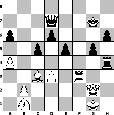 game notation in PGN-format [Event "around 1500"] [Site "www.myChess.de"] [Date "2005.02.03"] [Round "2"] [White "rikilatic"] [Black "Jonas84"] [ECO "A00"] [WhitemyELO "1573"] [BlackmyELO "1458"] [Result "1-0"] [TimeControl "10/864000"] [WhiteDays "10"] [BlackDays "10"] [MyChessNo "10158"] 1. Nc3 c5 2. e4 e6 3. Qf3 Nc6 4. Bd3 g6 5. Nge2 Bg7 6. Nb5 d6 7. c3 Nf6 8. Qg3 e5 9. Bc2 O-O 10. d3 a6 11. N5a3 b5 12. Bg5 b4 13. cxb4 Nxb4 14. O-O h6 15. Bd2 Nxc2 16. Nxc2 Bb7 17. Qh3 Bc8 18. Qe3 Ng4 19. Qg3 f5 20. exf5 Bxf5 21. h3 Nf6 22. Qh4 g5 23. Qc4+ Kh8 24. Ne3 Bd7 25. a4 Qe7 26. Ng3 Be6 27. Qc1 Nd5 28. Nxd5 Bxd5 29. Nh5 Rf5 30. Nxg7 Qxg7 31. Qd1 Qb7 32. f3 Raf8 33. Bc3 Bxf3 34. gxf3 Rxf3 35. Rxf3 Rxf3 36. Qe2 Rxh3 37. Qg2 Qd7 38. Rf1 Rh4 39. Rf8+ Kg7 40. Rf3 1-0 position notation in FEN-format 8/3q2k1/p2p3p/2p1p1p1/P6r/2BP1R2/1P4Q1/1N4K1 - - - 7 40 Captured white pieces: Captured black pieces: Click on a captured piece in order to display the desired move!
