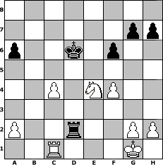 game notation in PGN-format [Event "Turnier in den M"] [Site "www.myChess.de"] [Date "2014.02.19"] [Round "1"] [White "Macks"] [Black "borsti"] [ECO "D20"] [WhitemyELO "1372"] [BlackmyELO "1229"] [Result "1-0"] [TimeControl "10/2592000"] [WhiteDays "29"] [BlackDays "30"] [MyChessNo "93079"] 1. d4 d5 2. c4 dxc4 3. e3 e5 4. Bxc4 Nc6 5. Ne2 a6 6. O-O Bd6 7. Nbc3 Be6 8. d5 Bxd5 9. Bxd5 Bb4 10. Bxc6+ bxc6 11. Qa4 Bxc3 12. Qxc6+ Kf8 13. Qxc3 f6 14. b3 Ne7 15. Ba3 Kf7 16. Bxe7 Qxe7 17. Rac1 Rhc8 18. Rfd1 Rd8 19. Rxd8 Rxd8 20. Qc4+ Qe6 21. Qxc7+ Rd7 22. Qc4 Qxc4 23. bxc4 Ke6 24. f4 Rd2 25. Nc3 exf4 26. exf4 Rd4 27. Ne2 Rd2 28. Nc3 Kd6 29. Ne4+ 1-0 position notation in FEN-format 8/6pp/p2k1p2/8/2P1NP2/8/P2r2PP/2R3K1 - - - 6 29 Captured white pieces: Captured black pieces: Click on a captured piece in order to display the desired move!