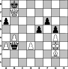 game notation in PGN-format [Event "^^Frohes neues Jahr^^"] [Site "www.myChess.de"] [Date "2007.12.29"] [Round "1"] [White "Helmut48"] [Black "Master1"] [ECO "C40"] [WhitemyELO "1395"] [BlackmyELO "1242"] [Result "1-0"] [TimeControl "10/864000"] [WhiteDays "39"] [BlackDays "35"] [MyChessNo "41071"] 1. e4 e5 2. Nf3 d5 3. exd5 Qxd5 4. Qe2 Nc6 5. Nc3 Qd6 6. h3 Nf6 7. d3 Be7 8. Bg5 Be6 9. a3 a6 10. g4 h6 11. Bxf6 Bxf6 12. Rd1 O-O-O 13. Bg2 g5 14. Nh2 Nd4 15. Qd2 h5 16. Ne4 Qe7 17. f3 hxg4 18. fxg4 Bd5 19. Qf2 Bxe4 20. Bxe4 Rxh3 21. Bg2 Rhh8 22. Kd2 c5 23. Nf3 Nxf3+ 24. Qxf3 Rxh1 25. Rxh1 Qc7 26. Qxf6 c4 27. Qf3 cxd3 28. cxd3 Qa5+ 29. b4 Qb6 30. Rc1+ Kb8 31. Ke2 Rd7 32. Qe4 f6 33. Qf5 Rc7 34. Rxc7 Qxc7 35. Qe4 Qc2+ 36. Kf3 Qd1+ 37. Kg3 Qb3 38. Qxb7# 1-0 position notation in FEN-format 1k6/1Q6/p4p2/4p1p1/1P4P1/Pq1P2K1/6B1/8 - - - 0 38 Captured white pieces: Captured black pieces: Click on a captured piece in order to display the desired move!