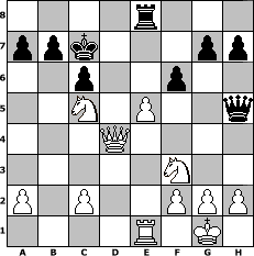 game notation in PGN-format [Event "Sei dabei am 1. Mai"] [Site "www.myChess.de"] [Date "2009.04.26"] [Round "1"] [White "Plaidroller"] [Black "Wilmy"] [ECO "C24"] [WhitemyELO "1799"] [BlackmyELO "1484"] [Result "1-0"] [TimeControl "10/2592000"] [WhiteDays "30"] [BlackDays "27"] [MyChessNo "55216"] 1. e4 e5 2. Bc4 Nf6 3. d4 Nxe4 4. dxe5 Qe7 5. Qe2 d5 6. Bxd5 Nc5 7. Nf3 c6 8. Bb3 Be6 9. Bxe6 Qxe6 10. Nc3 Be7 11. O-O Nbd7 12. Re1 O-O-O 13. b4 Rhe8 14. bxc5 Nxc5 15. Be3 f6 16. Bxc5 Bxc5 17. Rad1 Qf5 18. Rxd8+ Rxd8 19. Ne4 Re8 20. Nxc5 Kc7 21. Qe4 Qh5 22. Qd4 1-0 position notation in FEN-format 4r3/ppk3pp/2p2p2/2N1P2q/3Q4/5N2/P1P2PPP/4R1K1 - - - 4 22 Captured white pieces: Captured black pieces: Click on a captured piece in order to display the desired move!