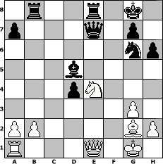 game notation in PGN-format [Event "Anf"] [Site "www.myChess.de"] [Date "2004.05.24"] [Round "1"] [White "Knight"] [Black "Joschi"] [ECO "A45"] [WhitemyELO "1216"] [BlackmyELO "1613"] [Result "0-1"] [TimeControl "10/864000"] [WhiteDays "40"] [BlackDays "40"] [MyChessNo "4809"] 1. d4 Nf6 2. g4 Nxg4 3. e4 Nf6 4. Nc3 d6 5. Bg2 Nc6 6. Bg5 h6 7. Bh4 e5 8. d5 Ne7 9. Nf3 Ng6 10. Bg3 Nh5 11. O-O Nxg3 12. fxg3 Be7 13. Nd2 O-O 14. Qf3 c6 15. dxc6 bxc6 16. Rf2 Bg5 17. Nc4 Be6 18. Bf1 d5 19. exd5 cxd5 20. Na3 d4 21. Ne4 Be3 22. Nc4 Bxf2+ 23. Qxf2 Bd5 24. Ncd2 Rc8 25. c3 f5 26. Bh3 fxe4 27. Qe1 Rb8 28. cxd4 exd4 29. Nxe4 Re8 30. Bg2 Qe7 0-1 position notation in FEN-format 1r2r1k1/p3q1p1/6np/3b4/3pN3/6P1/PP4BP/R3Q1K1 - - - 3 31 Captured white pieces: Captured black pieces: Click on a captured piece in order to display the desired move!