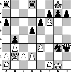 game notation in PGN-format [Event "Unser WM-Turnier"] [Site "www.myChess.de"] [Date "2018.07.07"] [Round "1"] [White "augustus"] [Black "Helmut48"] [ECO "A45"] [WhitemyELO "1073"] [BlackmyELO "2030"] [Result "0-1"] [TimeControl "10/3456000"] [WhiteDays "40"] [BlackDays "40"] [MyChessNo "112543"] 1. d4 Nf6 2. e3 e6 3. Nc3 d5 4. Nf3 c5 5. Bb5+ Bd7 6. Bxd7+ Nbxd7 7. Ne5 Bd6 8. O-O Nxe5 9. dxe5 Bxe5 10. Na4 O-O 11. f4 Bd6 12. Nc3 a6 13. Qd3 b5 14. f5 Qc7 15. g3 Bxg3 16. hxg3 Qxg3+ 17. Kh1 Qh4+ 18. Kg1 Qg3+ 19. Kh1 Qh3+ 20. Kg1 Qg4+ 21. Kh1 b4 22. Ne2 Ne4 23. b3 Rfd8 24. Bb2 c4 25. Qd4 c3 26. f6 Qh5+ 27. Kg2 Qxe2+ 28. Kg1 Qg4+ 29. Kh1 Qh3+ 30. Kg1 cxb2 31. Qxb2 Ng3 0-1 position notation in FEN-format r2r2k1/5ppp/p3pP2/3p4/1p6/1P2P1nq/PQPP4/R4RK1 - - - 1 32 Captured white pieces: Captured black pieces: Click on a captured piece in order to display the desired move!