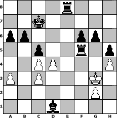 game notation in PGN-format [Event "wie w"] [Site "www.myChess.de"] [Date "2013.11.16"] [Round "1"] [White "borsti"] [Black "Vahl1"] [ECO "C42"] [WhitemyELO "1203"] [BlackmyELO "1667"] [Result "0-1"] [TimeControl "10/1728000"] [WhiteDays "20"] [BlackDays "20"] [MyChessNo "91159"] 1. e4 e5 2. Nf3 Nf6 3. Nxe5 d6 4. Nf3 Nxe4 5. d3 Nf6 6. Bg5 h6 7. Bxf6 Qxf6 8. Nc3 Nc6 9. Be2 Be6 10. O-O d5 11. Re1 Bb4 12. Qd2 d4 13. Nxd4 Nxd4 14. a3 Bxc3 15. Qxc3 Nxe2+ 16. Rxe2 Qxc3 17. bxc3 O-O-O 18. c4 Rhe8 19. Rae1 c5 20. f4 g6 21. Kf2 Re7 22. Re5 b6 23. Kf3 h5 24. h3 Rde8 25. h4 f6 26. R5e4 a6 27. d4 Bg4+ 28. Kf2 Rxe4 29. Rb1 Kc7 30. c3 Rxf4+ 31. Kg3 Rf5 32. Rd1 Bxd1 0-1 position notation in FEN-format 4r3/2k5/pp3pp1/2p2r1p/2PP3P/P1P3K1/6P1/3b4 - - - 0 33 Captured white pieces: Captured black pieces: Click on a captured piece in order to display the desired move!