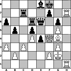 game notation in PGN-format [Event "°°°°°Auf den Fr"] [Site "www.myChess.de"] [Date "2009.04.05"] [Round "1"] [White "Tomino"] [Black "RashimIbenRohal"] [ECO "A46"] [WhitemyELO "1688"] [BlackmyELO "1597"] [Result "1-0"] [TimeControl "10/864000"] [WhiteDays "04"] [BlackDays "24"] [MyChessNo "54546"] 1. d4 Nf6 2. Nf3 d5 3. Bf4 e6 4. e3 Be7 5. Bd3 O-O 6. h3 c5 7. c3 Nc6 8. Nbd2 Bd7 9. Ne5 cxd4 10. exd4 Qb6 11. Rb1 Rac8 12. O-O Rfd8 13. Qe2 Be8 14. Ng4 Nxg4 15. hxg4 Na5 16. g3 Bd6 17. Bxd6 Qxd6 18. g5 a6 19. Kg2 b5 20. a3 Nc4 21. Rh1 g6 22. Rh6 Nxd2 23. Qxd2 e5 24. Rbh1 e4 25. Rxh7 Kf8 26. Qe3 Qe6 27. Be2 Rc7 28. Qf4 Rd6 29. Bg4 1-0 position notation in FEN-format 4bk2/2r2p1R/p2rq1p1/1p1p2P1/3PpQB1/P1P3P1/1P3PK1/7R - - - 8 29 Captured white pieces: Captured black pieces: Click on a captured piece in order to display the desired move!
