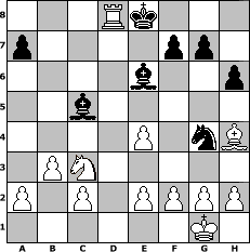 game notation in PGN-format [Event "5 Jahre Wikinger"] [Site "www.myChess.de"] [Date "2009.12.13"] [Round "1"] [White "UPS"] [Black "beowulf"] [ECO "C44"] [WhitemyELO "1682"] [BlackmyELO "1340"] [Result "1-0"] [TimeControl "10/864000"] [WhiteDays "10"] [BlackDays "10"] [MyChessNo "61530"] 1. e4 e5 2. Nf3 Nc6 3. d4 d6 4. dxe5 dxe5 5. Qxd8+ Kxd8 6. Bb5 Bc5 7. Bxc6 bxc6 8. Nxe5 Be6 9. Nxc6+ Kd7 10. Ne5+ Kd6 11. Bf4 Ke7 12. O-O Nf6 13. Nc3 Rab8 14. Nc6+ Kd7 15. Nxb8+ Rxb8 16. Rad1+ Ke7 17. b3 Rd8 18. Bxc7 Rxd1 19. Rxd1 Ng4 20. Bd8+ Ke8 21. Bh4 h6 22. Rd8# 1-0 position notation in FEN-format 3Rk3/p4pp1/4b2p/2b5/4P1nB/1PN5/P1P1PPPP/6K1 - - - 1 22 Captured white pieces: Captured black pieces: Click on a captured piece in order to display the desired move!