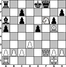 game notation in PGN-format [Event "Fr"] [Site "www.myChess.de"] [Date "2004.04.24"] [Round "1"] [White "Nightflight"] [Black "Knight"] [ECO "C57"] [WhitemyELO "1581"] [BlackmyELO "1447"] [Result "1-0"] [TimeControl "10/2592000"] [WhiteDays "59"] [BlackDays "60"] [MyChessNo "4123"] 1. e4 e5 2. Nf3 Nc6 3. Bc4 Nf6 4. Ng5 d5 5. exd5 Nxd5 6. Nxf7 Kxf7 7. Qf3+ Ke8 8. Bxd5 Qf6 9. Bxc6+ bxc6 10. Qh5+ g6 11. Qe2 Bc5 12. O-O a5 13. d3 Ba6 14. Nd2 Rf8 15. Ne4 Qe7 16. Bg5 Bxf2+ 17. Rxf2 Rxf2 18. Qxf2 Qf8 19. Nf6+ 1-0 position notation in FEN-format r3kq2/2p4p/b1p2Np1/p3p1B1/8/3P4/PPP2QPP/R5K1 - - - 2 19 Captured white pieces: ![]() ![]() ![]() ![]() ![]() ![]() ![]() ![]() ![]() ![]() ![]() ![]() ![]() ![]() ![]() Captured black pieces: ![]() ![]() ![]() ![]() ![]() ![]() ![]() ![]() ![]() ![]() ![]() ![]() ![]() ![]() ![]() Click on a captured piece in order to display the desired move!