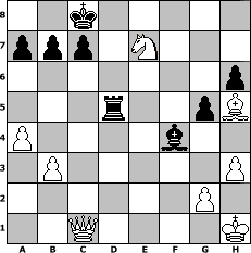 game notation in PGN-format [Event "Spring 2017"] [Site "www.myChess.de"] [Date "2017.03.21"] [Round "1"] [White "lotchi"] [Black "shan"] [ECO "B06"] [WhitemyELO "1211"] [BlackmyELO "1308"] [Result "1-0"] [TimeControl "10/2592000"] [WhiteDays "120"] [BlackDays "120"] [MyChessNo "107431"] 1. e4 g6 2. Nc3 d6 3. Nf3 e5 4. d3 h6 5. h3 Nc6 6. a3 Nf6 7. Be3 Be7 8. Be2 Be6 9. Nd5 Nxd5 10. exd5 Bxd5 11. b3 Qd7 12. c4 Be6 13. O-O O-O-O 14. Bd2 f6 15. Nh2 f5 16. f3 d5 17. cxd5 Bxd5 18. a4 g5 19. Qc2 Nb4 20. Bxb4 Bxb4 21. Qb2 Rhe8 22. Rfd1 Bc5+ 23. Kh1 e4 24. Rdc1 Be3 25. Rd1 Qd6 26. Nf1 Bf2 27. fxe4 Bb6 28. exd5 Qc5 29. d4 Qxd5 30. Bh5 Re7 31. Qc2 Bxd4 32. Ng3 Bxa1 33. Rxd5 Rxd5 34. Qc1 Be5 35. Nxf5 Bf4 36. Nxe7+ 1-0 position notation in FEN-format 2k5/ppp1N3/7p/3r2pB/P4b2/1P5P/6P1/2Q4K - - - 0 36 Captured white pieces: Captured black pieces: Click on a captured piece in order to display the desired move!