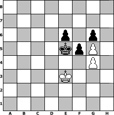 game notation in PGN-format [Event "April April"] [Site "www.myChess.de"] [Date "2014.04.03"] [Round "2"] [White "alibengali"] [Black "Joschi"] [ECO "A03"] [WhitemyELO "1666"] [BlackmyELO "1535"] [Result "0-1"] [TimeControl "10/2592000"] [WhiteDays "154"] [BlackDays "180"] [MyChessNo "93853"] 1. f4 d5 2. Nf3 Nf6 3. e3 Nc6 4. Bb5 Bd7 5. O-O e6 6. d4 Bd6 7. Nc3 a6 8. Bd3 Nb4 9. a3 Nxd3 10. Qxd3 c5 11. dxc5 Bxc5 12. b4 Ba7 13. Bb2 O-O 14. a4 Ng4 15. Rfe1 Qe7 16. Ba3 Rfc8 17. b5 Bc5 18. bxa6 bxa6 19. Ng5 g6 20. Bxc5 Qxc5 21. h3 Qxc3 22. hxg4 Qxc2 23. Qd4 Qc3 24. Qb6 Qc6 25. Qd4 Qc3 26. Qd1 h6 27. Nf3 Qc2 28. Nd4 Qxd1 29. Rexd1 Rc3 30. Kf2 Rac8 31. a5 R8c5 32. Rdb1 Rc7 33. Rb6 Ra7 34. Kf3 Rc5 35. g5 hxg5 36. fxg5 Bb5 37. Nxb5 axb5 38. a6 b4 39. Rxb4 Rc6 40. Rba4 Kf8 41. Kf4 Ke7 42. g4 Kd6 43. e4 Rc4 44. Rxc4 dxc4 45. Ke3 Kc5 46. e5 Kb5 47. Rb1+ Kxa6 48. Ra1+ Kb6 49. Rxa7 Kxa7 50. Kd4 Kb6 51. Kxc4 Kc6 52. Kd4 Kb5 53. Ke4 Kc4 54. Ke3 Kd5 55. Kf4 Kd4 56. Kf3 Kxe5 57. Ke3 f5 0-1 position notation in FEN-format 8/8/4p1p1/4kpP1/6P1/4K3/8/8 - - - 0 58 Captured white pieces: Captured black pieces: Click on a captured piece in order to display the desired move!