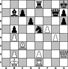 game notation in PGN-format [Event "Pedro Damiano"] [Site "www.myChess.de"] [Date "2016.09.18"] [Round "2"] [White "Knight"] [Black "Joschi"] [ECO "C40"] [WhitemyELO "1137"] [BlackmyELO "1531"] [Result "0-1"] [TimeControl "10/2592000"] [WhiteDays "120"] [BlackDays "120"] [MyChessNo "105002"] 1. e4 e5 2. Nf3 f6 3. Nxe5 fxe5 4. Nc3 Nf6 5. d4 exd4 6. Qxd4 Nc6 7. Qe3 Bb4 8. Bd2 O-O 9. O-O-O d6 10. Re1 Re8 11. Bb5 Bd7 12. Kb1 Bxc3 13. Bxc3 Rxe4 14. Qd2 Rxe1+ 15. Rxe1 Qf8 16. h4 a6 17. Ba4 b5 18. Bb3+ Kh8 19. a3 Rd8 20. f3 Bc8 21. a4 Bb7 22. g4 Nd7 23. f4 Nc5 24. axb5 Nxb3 25. cxb3 axb5 26. f5 Qf7 27. b4 Re8 28. h5 Ne5 29. h6 gxh6 30. Qh2 Qg7 0-1 position notation in FEN-format 4r2k/1bp3qp/3p3p/1p2nP2/1P4P1/2B5/1P2P2Q/1K2R3 - - - 2 31 Captured white pieces: Captured black pieces: Click on a captured piece in order to display the desired move!
