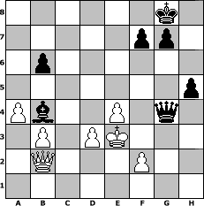 game notation in PGN-format [Event "^^Lust, Laune und Spannung am Schach!!!^^"] [Site "www.myChess.de"] [Date "2007.09.24"] [Round "1"] [White "Helmut48"] [Black "bernhard"] [ECO "C41"] [WhitemyELO "1446"] [BlackmyELO "1605"] [Result "0-1"] [TimeControl "10/864000"] [WhiteDays "40"] [BlackDays "40"] [MyChessNo "38458"] 1. e4 e5 2. Nf3 d6 3. h3 Be7 4. d3 Nf6 5. c3 Nc6 6. Qb3 O-O 7. Bg5 Be6 8. c4 b6 9. Nc3 a5 10. a4 Nb4 11. Nd5 h6 12. Bxf6 Bxf6 13. Nxb4 axb4 14. Qxb4 c6 15. b3 d5 16. Rc1 Be7 17. Qd2 Qb8 18. cxd5 cxd5 19. exd5 Bxd5 20. Qc2 Bxf3 21. gxf3 Bb4+ 22. Kd1 Qd6 23. Bg2 Rac8 24. Qb1 Rxc1+ 25. Kxc1 Rc8+ 26. Kd1 Qc5 27. Ke2 e4 28. fxe4 Qg5 29. Rd1 Qxg2 30. Rc1 Qxh3 31. Rxc8+ Qxc8 32. Qb2 Qg4+ 33. Ke3 h5 0-1 position notation in FEN-format 6k1/5pp1/1p6/7p/Pb2P1q1/1P1PK3/1Q3P2/8 - - - 0 34 Captured white pieces: Captured black pieces: Click on a captured piece in order to display the desired move!