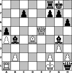 game notation in PGN-format [Event "Turnier in den M"] [Site "www.myChess.de"] [Date "2014.02.19"] [Round "1"] [White "Mattheus"] [Black "Macks"] [ECO "B00"] [WhitemyELO "1218"] [BlackmyELO "1372"] [Result "0-1"] [TimeControl "10/2592000"] [WhiteDays "30"] [BlackDays "30"] [MyChessNo "93063"] 1. e4 Nc6 2. d4 d5 3. Nc3 dxe4 4. Be3 e6 5. Nxe4 Nf6 6. Nxf6+ Qxf6 7. Nf3 Bd6 8. Bb5 h6 9. O-O Bd7 10. Re1 O-O 11. Qc1 a6 12. Ba4 b5 13. Bb3 a5 14. a4 b4 15. c3 Bc8 16. d5 Nd8 17. dxe6 Nxe6 18. Bxe6 Bxe6 19. Bd4 Qg6 20. cxb4 Bh3 21. g3 Qg4 22. Qe3 Bxb4 23. Ne5 Qc8 24. Re2 Qb7 25. Nf3 Rae8 26. Qd3 Rxe2 27. Qxe2 Bg4 28. Kg2 Qa8 29. Qe5 Qxf3+ 30. Kf1 Qh1# 0-1 position notation in FEN-format 5rk1/2p2pp1/7p/p3Q3/Pb1B2b1/6P1/1P3P1P/R4K1q - - - 2 31 Captured white pieces: Captured black pieces: Click on a captured piece in order to display the desired move!