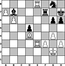 game notation in PGN-format [Event "Broadsword Chess"] [Site "www.myChess.de"] [Date "2014.06.15"] [Round "1"] [White "HenrySchinasky"] [Black "haggard"] [ECO "B36"] [WhitemyELO "2113"] [BlackmyELO "2003"] [Result "1-0"] [TimeControl "10/864000"] [WhiteDays "47"] [BlackDays "59"] [MyChessNo "94833"] 1. e4 c5 2. Nf3 Nc6 3. d4 cxd4 4. Nxd4 g6 5. c4 Nf6 6. Nc3 d6 7. Be2 Nxd4 8. Qxd4 Bg7 9. O-O O-O 10. Qd3 Nd7 11. Be3 Nc5 12. Qc2 Bxc3 13. Qxc3 Nxe4 14. Qd4 Nf6 15. Bf3 Qc7 16. Rac1 Bf5 17. c5 Rfd8 18. h3 d5 19. Bf4 Qc6 20. Bd1 Ne4 21. f3 Nf6 22. Re1 Be6 23. a4 Nh5 24. Bh6 Nf6 25. a5 Qc7 26. b4 Qc6 27. Ra1 b6 28. cxb6 axb6 29. a6 b5 30. a7 Rd7 31. Be2 Rb7 32. Ra5 Qd7 33. Rc1 Bf5 34. g4 Be6 35. Kg2 Qd8 36. Bxb5 Bd7 37. Bd3 Be8 38. Re1 Bc6 39. Bd2 Rd7 40. b5 Bb7 41. Bc3 h6 42. Ra2 Rc8 43. Ba5 Qf8 44. Rae2 Kh7 45. Bb4 Ng8 46. b6 Ba8 47. Ba6 Rc6 48. Bb5 Qc8 49. Bxc6 Qxc6 50. Bxe7 f6 51. Re6 Qb7 52. Bxf6 Rf7 53. Bh8 Qc8 54. Re8 Qc2+ 55. R1e2 Qb3 56. Qe3 Qxe3 57. R2xe3 Bb7 58. Bd4 1-0 position notation in FEN-format 4R1n1/Pb3r1k/1P4pp/3p4/3B2P1/4RP1P/6K1/8 - - - 2 58 Captured white pieces: Captured black pieces: Click on a captured piece in order to display the desired move!