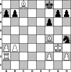 game notation in PGN-format [Event "Es weihnachtet sehr"] [Site "www.myChess.de"] [Date "2021.12.20"] [Round "1"] [White "Mynona"] [Black "skuehnel"] [ECO "D00"] [WhitemyELO "1353"] [BlackmyELO "1270"] [Result "1-0"] [TimeControl "10/864000"] [WhiteDays "10"] [BlackDays "10"] [MyChessNo "123949"] 1. d4 d5 2. Bf4 Bf5 3. e3 e6 4. c4 c5 5. Nf3 Qb6 6. b3 cxd4 7. Nxd4 dxc4 8. Bxc4 Bb4+ 9. Nd2 Ne7 10. O-O O-O 11. N2f3 Rd8 12. a3 Bc3 13. Ra2 Nbc6 14. Qc1 Nxd4 15. Qxc3 Nxf3+ 16. gxf3 Qc6 17. Kg2 Ng6 18. Kg3 Bd3 19. Rc1 f6 20. e4 Bxe4 21. fxe4 Qxe4 22. Qf3 Qxf3+ 23. Kxf3 Rac8 24. Bxe6+ Kf8 25. Rxc8 Rxc8 26. Bxc8 Nh4+ 27. Kg3 1-0 position notation in FEN-format 2B2k2/pp4pp/5p2/8/5B1n/PP4K1/R4P1P/8 - - - 2 27 Captured white pieces: Captured black pieces: Click on a captured piece in order to display the desired move!