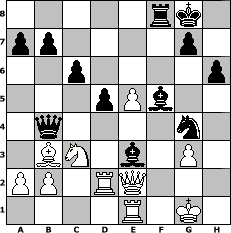 game notation in PGN-format [Event "Eine zentrale Er"] [Site "www.myChess.de"] [Date "2009.05.20"] [Round "2"] [White "rkoelbach"] [Black "murphy12"] [ECO "C65"] [WhitemyELO "1481"] [BlackmyELO "1596"] [Result "0-1"] [TimeControl "10/2592000"] [WhiteDays "81"] [BlackDays "90"] [MyChessNo "55938"] 1. e4 e5 2. Nf3 Nc6 3. Bb5 Nf6 4. O-O Bc5 5. c3 O-O 6. d4 exd4 7. cxd4 Bb6 8. Nc3 Ne7 9. h3 c6 10. Ba4 d5 11. e5 Ne4 12. Bc2 f5 13. exf6 Nxf6 14. Re1 Bf5 15. Bb3 Bc7 16. Bg5 Qd6 17. Ne5 Ng6 18. h4 h6 19. Bd2 Nxh4 20. g3 Ng6 21. f4 Qb4 22. Be3 Nxe5 23. fxe5 Ng4 24. Qe2 Bb6 25. Rad1 Rae8 26. Rd2 Rxe5 27. dxe5 Bxe3+ 0-1 position notation in FEN-format 5rk1/pp4p1/2p4p/3pPb2/1q4n1/1BN1b1P1/PP1RQ3/4R1K1 - - - 0 28 Captured white pieces: Captured black pieces: Click on a captured piece in order to display the desired move!