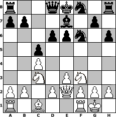 game notation in PGN-format [Event "Fr"] [Site "www.myChess.de"] [Date "2004.04.24"] [Round "1"] [White "torsten64"] [Black "Nightflight"] [ECO "A56"] [WhitemyELO "1824"] [BlackmyELO "1581"] [Result "1/2-1/2"] [TimeControl "10/2592000"] [WhiteDays "37"] [BlackDays "29"] [MyChessNo "4125"] 1. d4 Nf6 2. c4 c5 3. d5 d6 4. Nc3 Bf5 5. e3 Nbd7 6. Nf3 e5 7. dxe6 fxe6 8. Bd3 Bg4 9. Be2 Be7 10. Ng5 Bxe2 11. Qxe2 Nf8 12. O-O h6 13. Nf3 1/2-1/2 position notation in FEN-format r2qkn1r/pp2b1p1/3ppn1p/2p5/2P5/2N1PN2/PP1PQPPP/R1B2RK1 - kq - 1 13 Captured white pieces: ![]() ![]() ![]() ![]() ![]() ![]() ![]() ![]() ![]() ![]() ![]() ![]() ![]() ![]() ![]() Captured black pieces: ![]() ![]() ![]() ![]() ![]() ![]() ![]() ![]() ![]() ![]() ![]() ![]() ![]() ![]() ![]() Click on a captured piece in order to display the desired move!