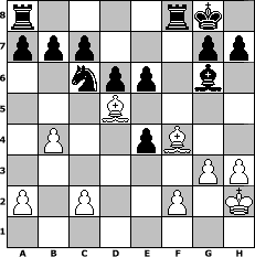 game notation in PGN-format [Event "Fr"] [Site "www.myChess.de"] [Date "2013.01.28"] [Round "1"] [White "Haki"] [Black "Meister64"] [ECO "C55"] [WhitemyELO "1195"] [BlackmyELO "1786"] [Result "0-1"] [TimeControl "10/864000"] [WhiteDays "10"] [BlackDays "10"] [MyChessNo "86333"] 1. e4 e5 2. Nf3 Nc6 3. Bc4 Nf6 4. O-O d6 5. Nc3 Bg4 6. h3 Bh5 7. Ne2 Nxe4 8. Nc3 Nxc3 9. dxc3 Be7 10. b4 O-O 11. Qd5 Bg6 12. Bb3 Bf6 13. Re1 e4 14. Ng5 Bxc3 15. Bf4 Bxa1 16. Rxa1 Qf6 17. g3 Qxa1+ 18. Kh2 Qd4 19. Ne6 Qxd5 20. Bxd5 fxe6 0-1 position notation in FEN-format r4rk1/ppp3pp/2npp1b1/3B4/1P2pB2/6PP/P1P2P1K/8 - - - 0 21 Captured white pieces: Captured black pieces: Click on a captured piece in order to display the desired move!