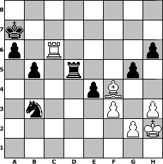 game notation in PGN-format [Event "Preu"] [Site "www.myChess.de"] [Date "2008.10.28"] [Round "1"] [White "Damenmatt"] [Black "paul"] [ECO "C65"] [WhitemyELO "1306"] [BlackmyELO "1286"] [Result "0-1"] [TimeControl "10/3456000"] [WhiteDays "000"] [BlackDays "140"] [MyChessNo "49226"] 1. e4 e5 2. Nf3 Nc6 3. Bb5 Nf6 4. c4 Nxe4 5. d3 Nc5 6. Nc3 d6 7. b4 Ne6 8. c5 dxc5 9. bxc5 Bxc5 10. Be3 Bb4 11. Qd2 Bd7 12. Qb2 Qe7 13. a3 Ba5 14. O-O Bxc3 15. Qxc3 f6 16. a4 a6 17. Bc4 O-O-O 18. Rfb1 Nc5 19. Bd5 Qd6 20. Bxc6 b6 21. Be4 Nxa4 22. Qc1 b5 23. d4 f5 24. dxe5 Qe6 25. Ng5 Qe7 26. e6 Bxe6 27. Nxe6 Qxe6 28. Qc2 fxe4 29. Rc1 Rd7 30. Qe2 h6 31. Ra2 Rhd8 32. Rac2 Rd3 33. Rxc7+ Kb8 34. R7c6 Qd7 35. h3 Rd1+ 36. Rxd1 Qxd1+ 37. Qxd1 Rxd1+ 38. Kh2 Rd5 39. Re6 Nc5 40. Rc6 Nb3 41. Bf4+ Ka7 42. f3 g5 0-1 position notation in FEN-format 8/k7/p1R4p/1p1r2p1/4pB2/1n3P1P/6PK/8 - - - 0 43 Captured white pieces: Captured black pieces: Click on a captured piece in order to display the desired move!